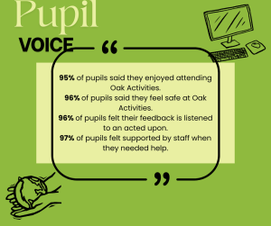We are able to offer 1:1 support at our Oak activity base at our 2 sites. We offer a safe and nurturing environment where students can follow a varied timetable to suit individual needs.